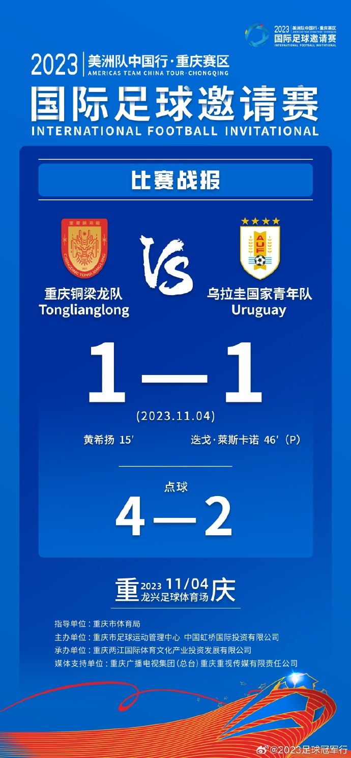 重庆铜梁龙对阵乌拉圭U20的友谊赛,双方常规时间1-1战平,点球大战中重庆铜梁龙以总比分5-3战胜乌拉圭U20。