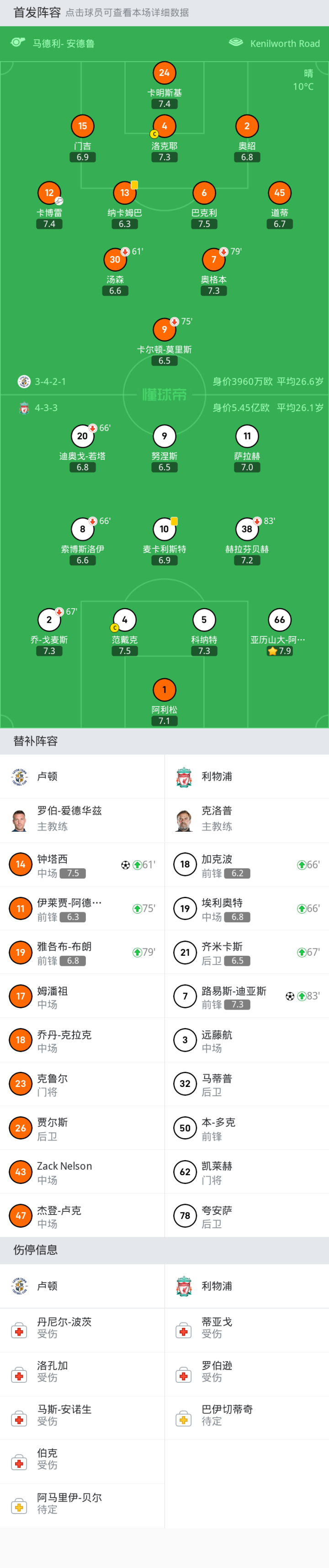 上场替补:67'21-齐米卡斯, 66'18-加克波, 83'7-路易斯-迪亚斯, 66'19-埃利奥特