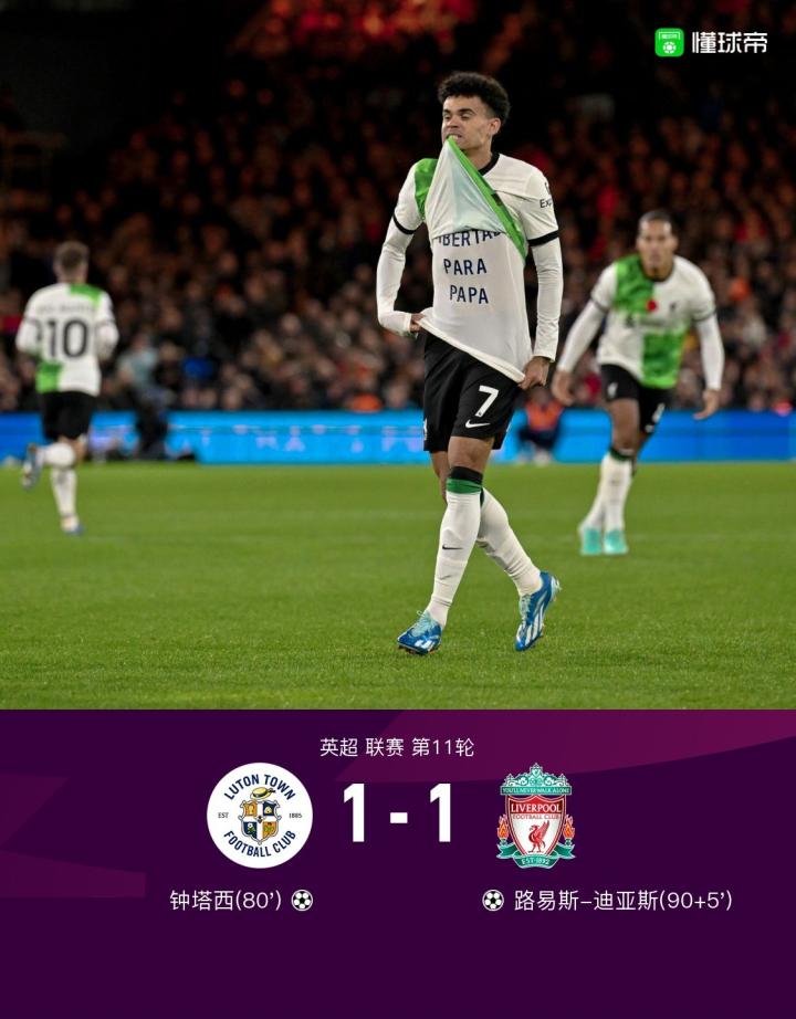 第90+5分钟,绝平!埃利奥特助攻迪亚斯用肩膀将球顶进,卢顿1-1利物浦