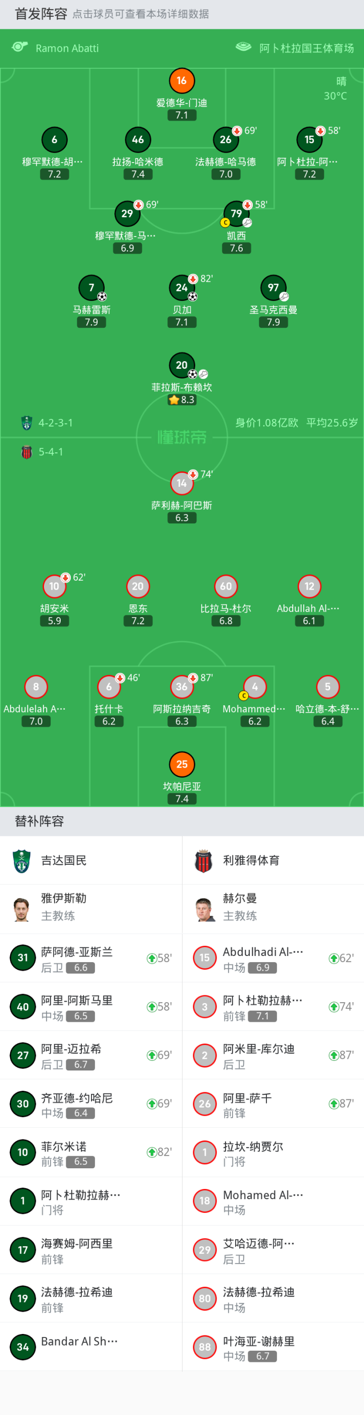 吉达国民首发:7-马赫雷斯, 16-爱德华-门迪, 97-圣马克西曼, 79-凯西, 15-阿卜杜拉-阿马尔, 20-菲拉斯-布赖坎, 29-穆罕默德-马吉哈德, 24-贝加, 6-穆罕默德-胡拉伊, 26-法赫德-哈马德, 46-拉扬-哈米德