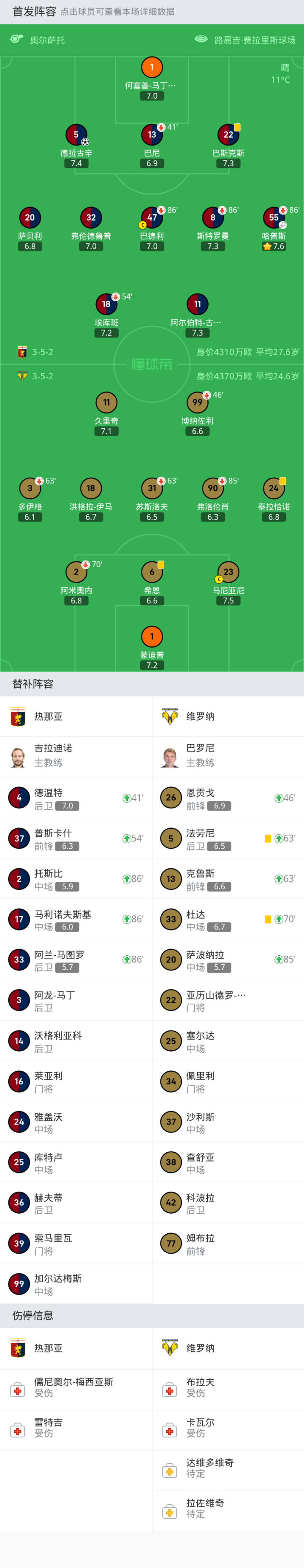 热那亚首发:8-斯特罗曼, 47-巴德利, 20-萨贝利, 13-巴尼, 11-阿尔伯特-古德蒙德松, 55-哈普斯, 18-埃库班, 1-何塞普-马丁内斯, 22-巴斯克斯, 32-弗伦德鲁普, 5-德拉古辛