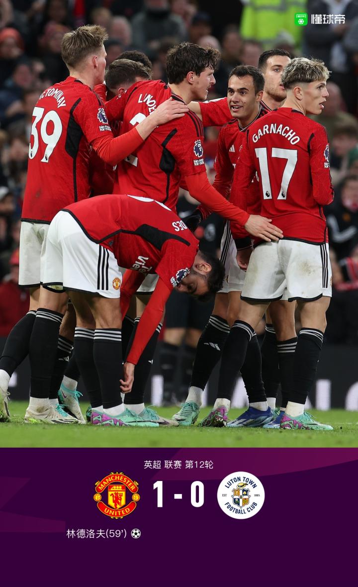 第59分钟,打破僵局!林德洛夫门前乱战中破门,曼联1-0卢顿