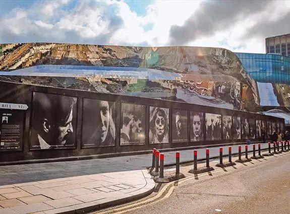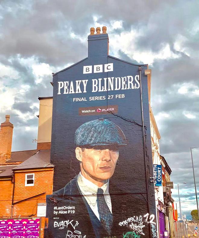 在Birmingham New Street火车站,旁边的围墙涂鸦就是谢尔比家族全画幅的人物照。