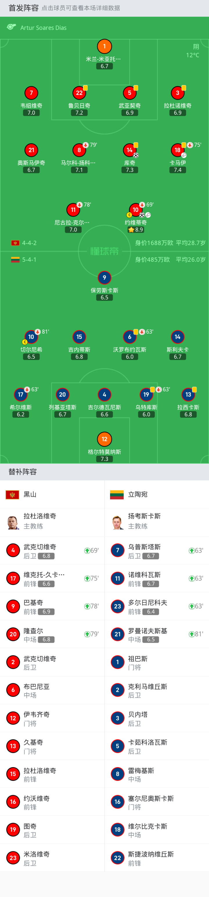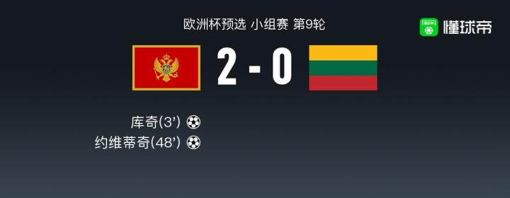 北京时间11月17日欧洲杯预选 小组赛 第9轮,黑山主场对阵立陶宛。黑山库奇破门,约维蒂奇破门。立陶宛。最终比分2-0。