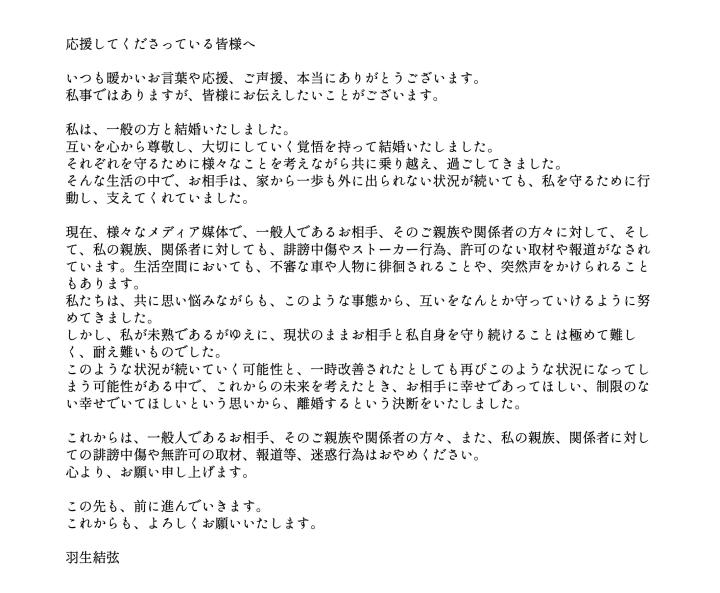 北京时间11月17日,日本花滑名将羽生结弦在个人官方账号宣布离婚,这距离他今年8月突然宣布结婚仅仅过去三个月。羽生结弦在声明中表示,是各种媒体在过去几个月内的各种骚扰与诽谤行为令他与妻子不堪重负,最终做出这样的决定来保护自己的爱人。