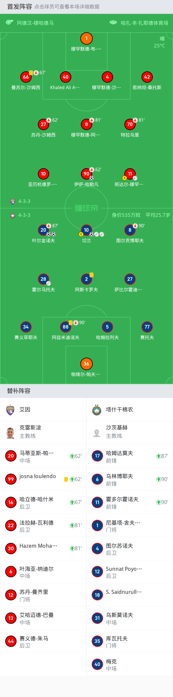 艾因首发:11-班达尔-穆罕默德, 1-穆罕默德-布-森达, 10-亚历杭德罗-罗梅罗, 27-苏丹-沙姆西, 4-穆罕默德-沙克尔, 42-若纳坦-桑托斯, 66-曼苏尔-沙姆西, 90-伊萨-哈勒凡, 8-穆罕默德-阿巴斯, 40-Khaled Ali Ahmed Abdulla·Al Balooshi, 70-特拉乌里