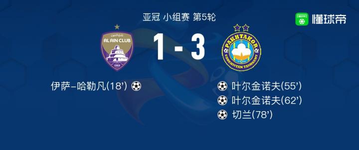 北京时间11月29日亚冠 小组赛 第5轮,艾因主场对阵塔什干棉农。艾因伊萨-哈勒凡破门。塔什干棉农叶尔金诺夫梅开二度,切兰破门。最终比分1-3。