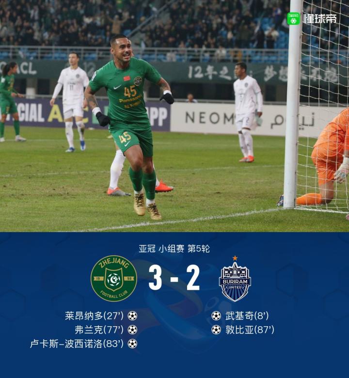 北京时间11月29日亚冠 小组赛 第5轮,浙江主场对阵武里南联。上半场武基奇率先破门,之后李提香助攻莱昂纳多破门扳平比分。下半场莱昂纳多助攻弗兰克破门将比分反超,之后弗兰克助攻卢卡斯破门扩大比分,随后敦比亚破门扳回一球。最终浙江3-2战胜武里南联保留理论出线希望。