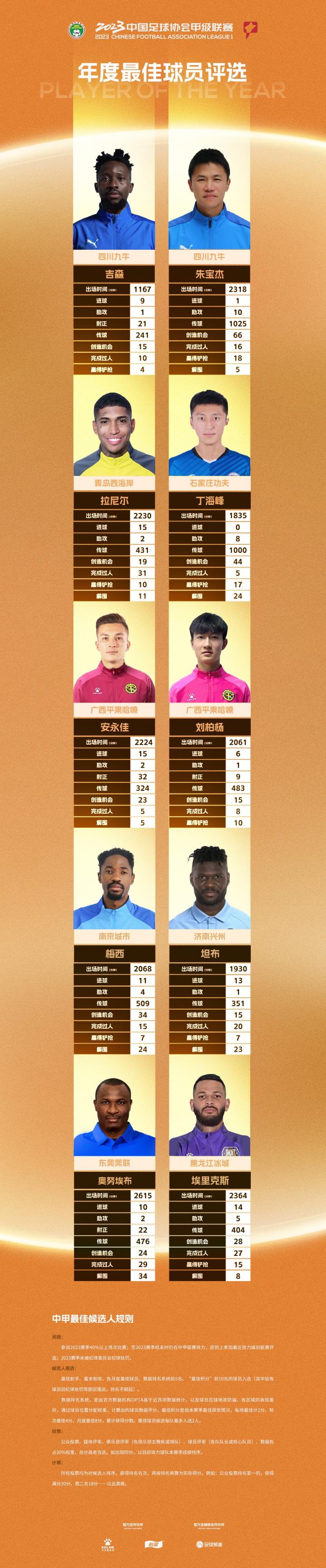 扫描下载懂球帝首页>动态> 中甲年度最佳球员候选:安永佳领衔,金靴奥格布无缘