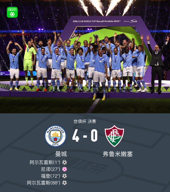 北京时间12月23日世俱杯 决赛,曼城主场对阵弗鲁米嫩塞。上半场开场40秒,阿尔瓦雷斯门前补射破门,这也是世俱杯历史上最快进球,福登横传造成尼诺自摆乌龙。下半场,阿尔瓦雷斯助攻福登包抄破门,比赛最后时刻,阿尔瓦雷斯锦上添花,最终,曼城4-0弗鲁米嫩塞夺得队史首座世俱杯冠军。