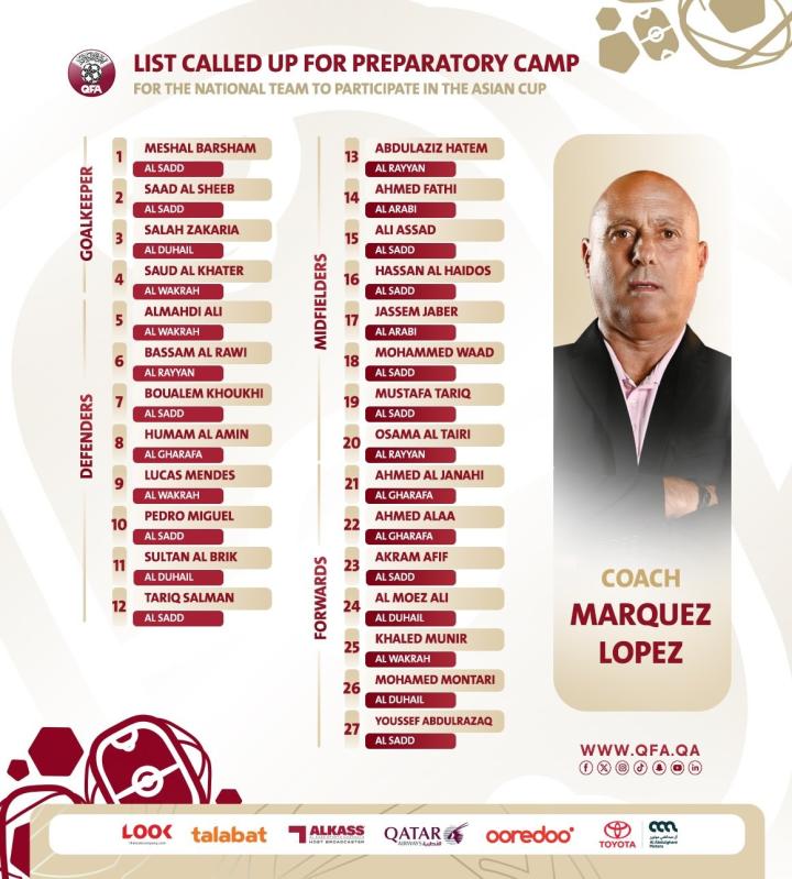 扫描下载懂球帝首页>动态> 国足对手卡塔尔亚洲杯27人集训名单:海多斯领衔,无留洋球员