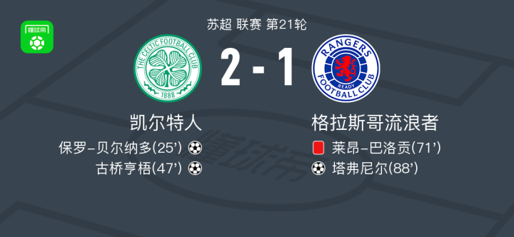 北京时间12月30日苏超 联赛 第21轮,凯尔特人主场对阵格拉斯哥流浪者。凯尔特人保罗-贝尔纳多破门,古桥亨梧破门。格拉斯哥流浪者塔弗尼尔破门。最终比分2-1。