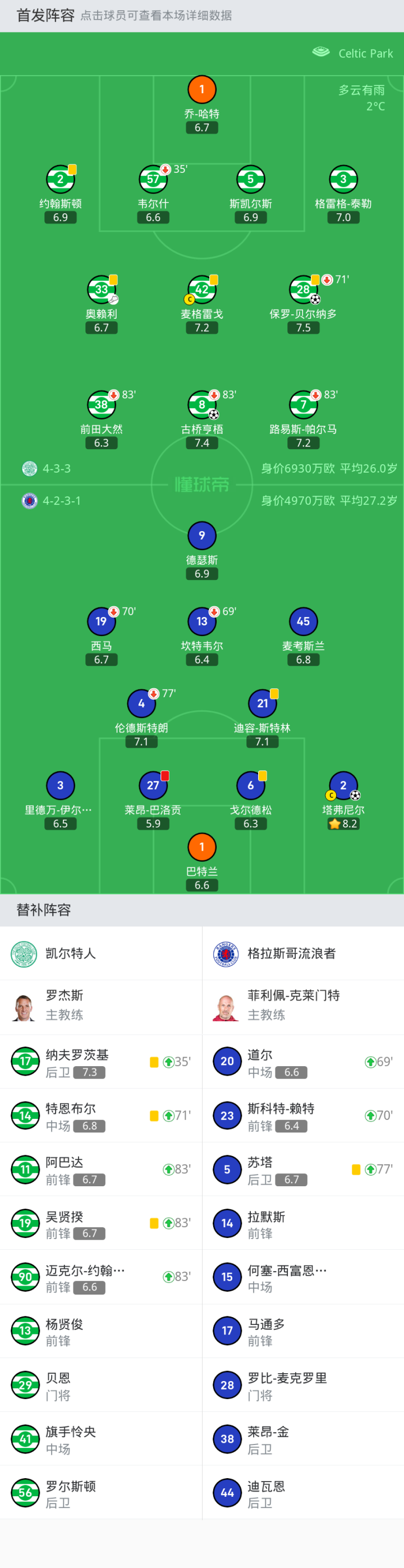 凯尔特人首发:1-乔-哈特, 42-麦格雷戈, 38-前田大然, 3-格雷格-泰勒, 5-斯凯尔斯, 8-古桥亨梧, 7-路易斯-帕尔马, 33-奥赖利, 2-约翰斯顿, 57-韦尔什, 28-保罗-贝尔纳多