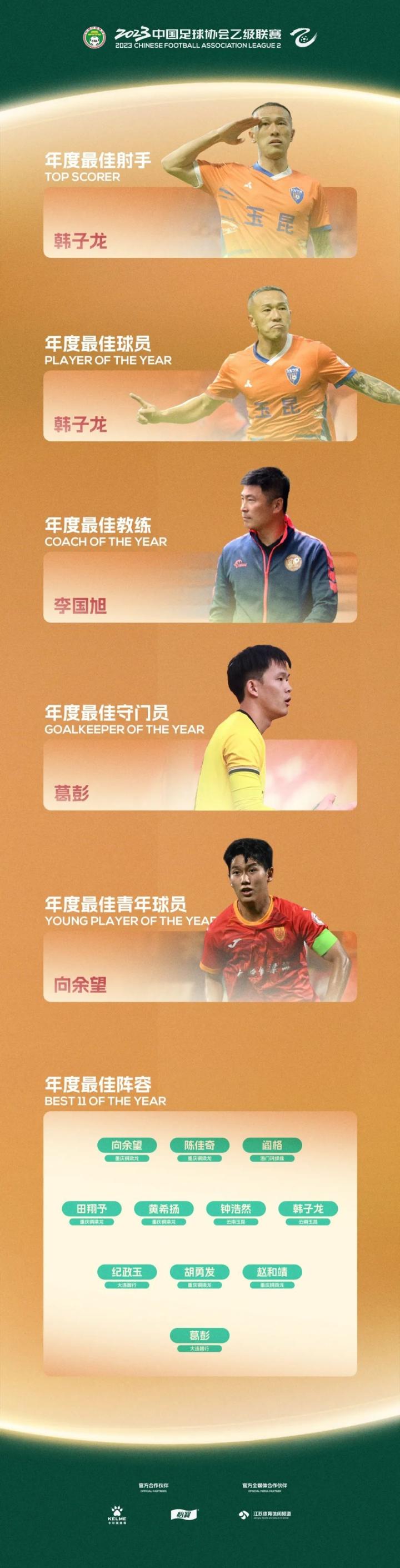 扫描下载懂球帝首页>动态> 中乙年度评选:韩子龙获最佳射手&球员,向余望最佳青年球员