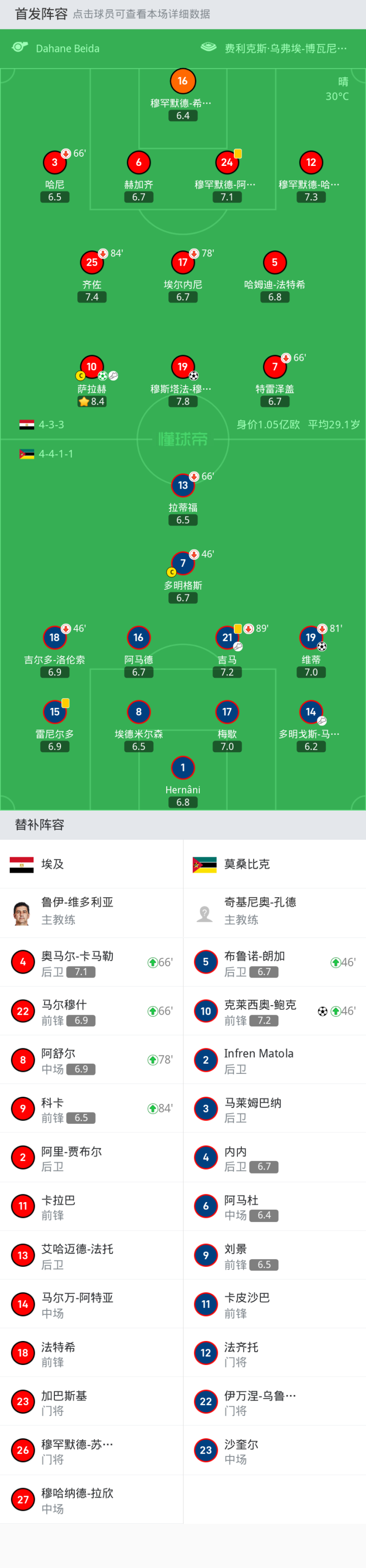 埃及首发:16-穆罕默德-希纳维, 6-赫加齐, 10-萨拉赫, 17-埃尔内尼, 7-特雷泽盖, 25-齐佐, 3-哈尼, 12-穆罕默德-哈姆迪, 19-穆斯塔法-穆罕默德, 5-哈姆迪-法特希, 24-穆罕默德-阿卜杜勒穆奈姆