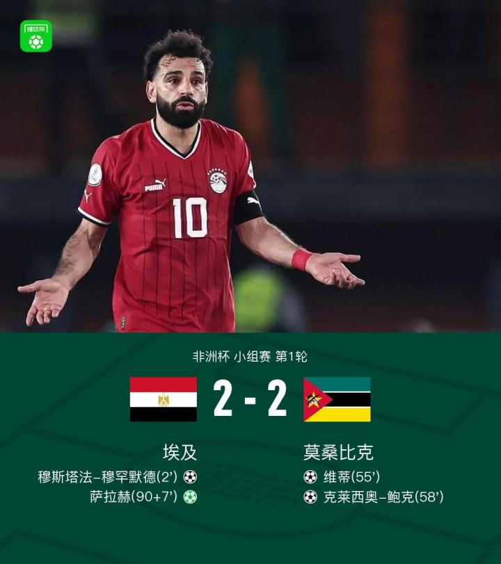 北京时间1月15日非洲杯 小组赛 第1轮,埃及主场对阵莫桑比克。上半场,萨拉赫助攻穆罕默德转身抽射破门,穆罕默德单刀机会抽射被扑,哈姆迪门前解围打在横梁上险些自摆乌龙;下半场,马坎扎助攻维蒂暴力头球入网扳平,鲍克过掉防守单刀破门反超比分,法特希蝎子摆尾击中立柱,穆罕默德造点后萨拉赫主罚命中上演绝平。最终比分2-2。