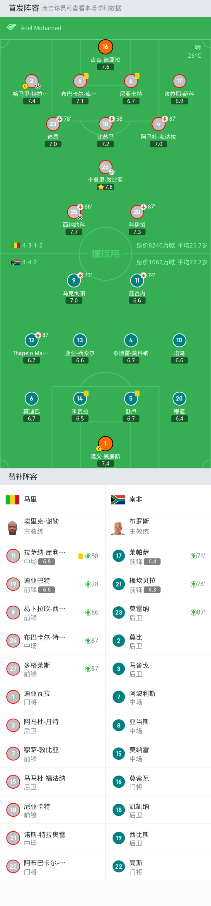 马里首发:2-哈马里-特拉奥雷, 16-吉吉-迪亚拉, 17-法拉耶-萨科, 4-阿马杜-海达拉, 20-科伊塔, 10-比苏马, 23-迪昂, 5-布巴卡尔-库亚特, 6-尼亚卡特, 25-西纳约科, 26-卡莫里-敦比亚