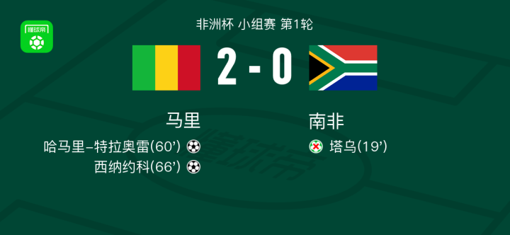 北京时间1月17日非洲杯 小组赛 第1轮,马里主场对阵南非。马里哈马里-特拉奥雷破门,西纳约科破门。南非。最终比分2-0。