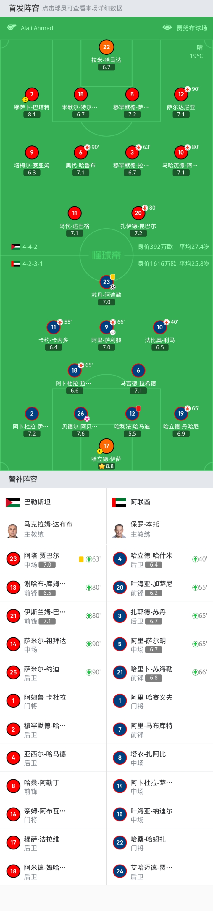 替换下场:55'11-卡约-卡内多, 40'10-法比奥-利马, 66'9-阿里-萨利赫, 65'19-哈立德-丹哈尼, 65'18-阿卜杜拉-拉马丹