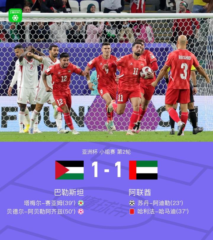 北京时间1月19日亚洲杯 小组赛 第2轮,巴勒斯坦对阵阿联酋。上半场,苏丹-阿迪勒抢点头槌为阿联酋首开记录,随后哈利法-哈马迪吃到红点套餐,但塔梅尔-赛亚姆主罚点球被扑出。下半场,贝德尔-阿贝勒阿齐兹诡异俯冲头球顶进自家球门帮助巴勒斯坦扳平比分。最终,巴勒斯坦和阿联酋1-1战平。