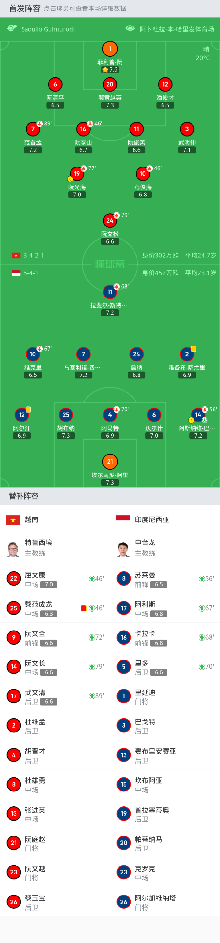 上场替补:72'9-阮文全, 89'17-武文清, 46'25-黎范成龙, 79'14-阮文长, 46'22-屈文康