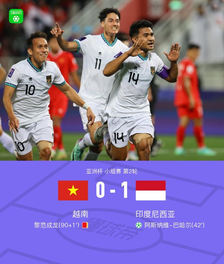 北京时间1月19日亚洲杯 小组赛 第2轮,越南对阵印度尼西亚。上半场,阿斯纳维-巴哈尔点射破门,斯特鲁伊克屡造险;下半场,双方加强身体对抗不断有球员受伤倒地,但均未能取得进球,补时黎范成龙染红。最终越南0-1不敌印尼,两战积0分被淘汰出局。