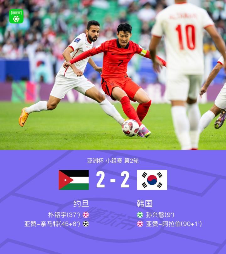 北京时间1月20日19:30,亚洲杯小组赛E组第2轮,约旦与韩国在阿图玛玛球场展开角逐,卡塔尔裁判萨勒曼-法拉希执法本场比赛。上半场,孙兴慜造点后勺子点球命中首开记录,随后约旦凭借朴镕宇的乌龙和亚赞-奈马特的远射破门实现逆转。下半场,黄仁范补时阶段打门造亚赞-阿拉伯乌龙。最终,韩国2-2绝平约旦。