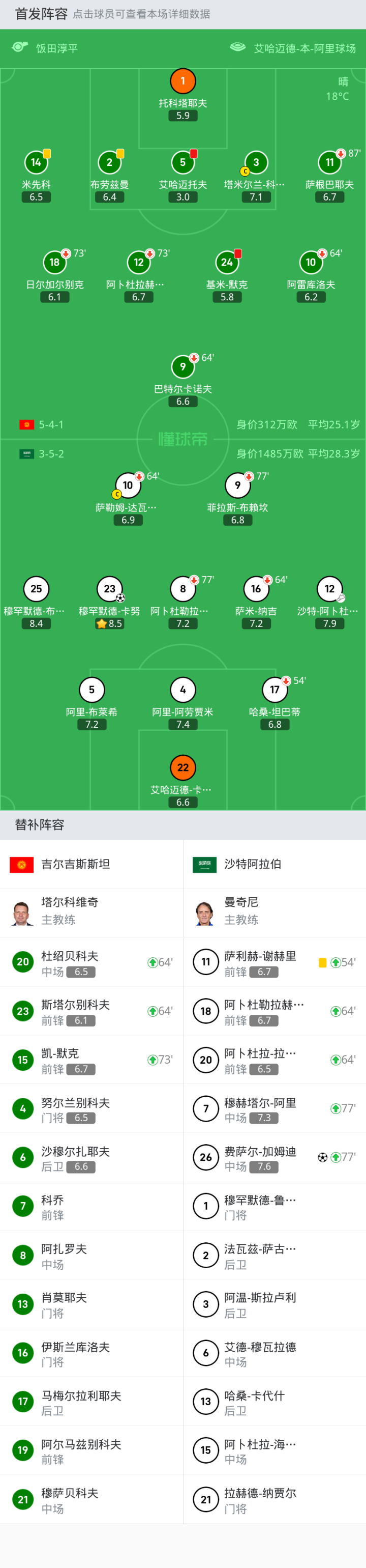 替换下场:73'18-日尔加尔别克, 87'11-萨根巴耶夫, 73'12-阿卜杜拉赫曼诺夫, 64'9-巴特尔卡诺夫, 64'10-阿雷库洛夫