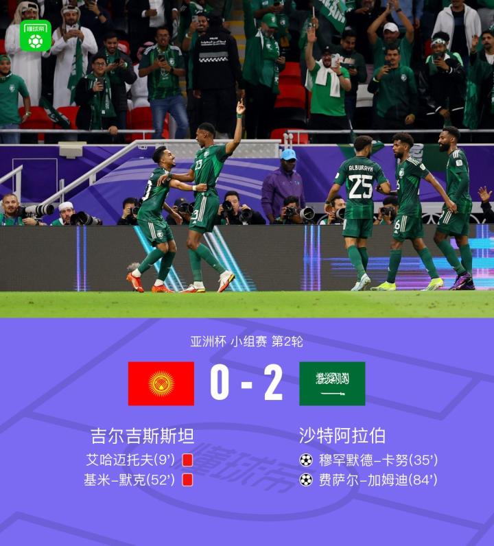 北京时间1月22日亚洲杯小组赛第2轮,吉尔吉斯斯坦主场对阵沙特阿拉伯。上半场开始不久,艾哈迈托夫因为蹬踏被直红罚下。阿卜杜勒哈米德传中,卡努端射破门。下半场开始不久,默克因为飞铲同样被直红罚下,吉尔吉斯斯坦九人应战。随后,加姆迪远射,吉尔吉斯斯坦门将出现扑救失误,皮球应声入网。全场比赛结束,沙特2-0轻取对手,以6分的成绩提前一轮小组出线。