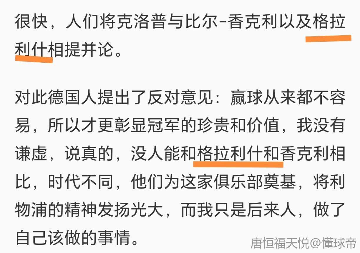 对此德国人提出了反对意见:赢球从来都不容易,所以才更彰显冠军的珍贵和价值,我没有谦虚,说真的,没人能和达格利什和香克利相比,时代不同,他们为这家俱乐部奠基,将利物浦的精神发扬光大,而我只是后来人,做了自己该做的事情。
