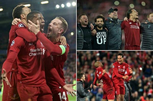 最终比分是4-0,利物浦人杀入决赛。比赛结束后,打入两球的维纳尔杜姆跪在草地上痛哭,所有人像疯了一样庆祝。克洛普带着全队在球迷死忠看台前一字排开,球员们眼含热泪,球迷们高唱永不独行,而克洛普则用自己招牌动作农夫三拳致敬所有人。