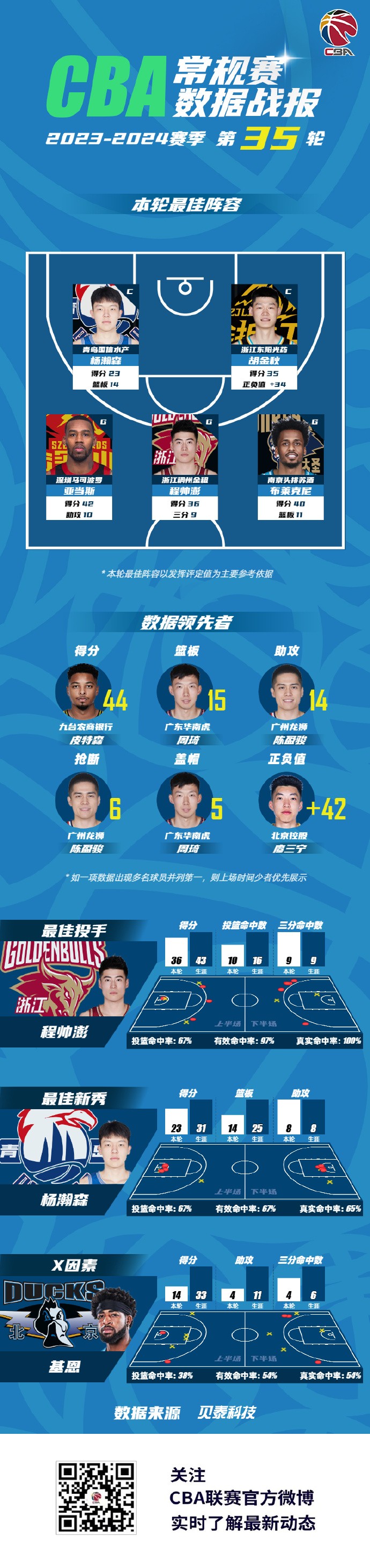 扫描下载懂球帝首页>动态> CBA常规赛第35轮数据战报公布:杨瀚森、胡金秋领衔最佳阵容