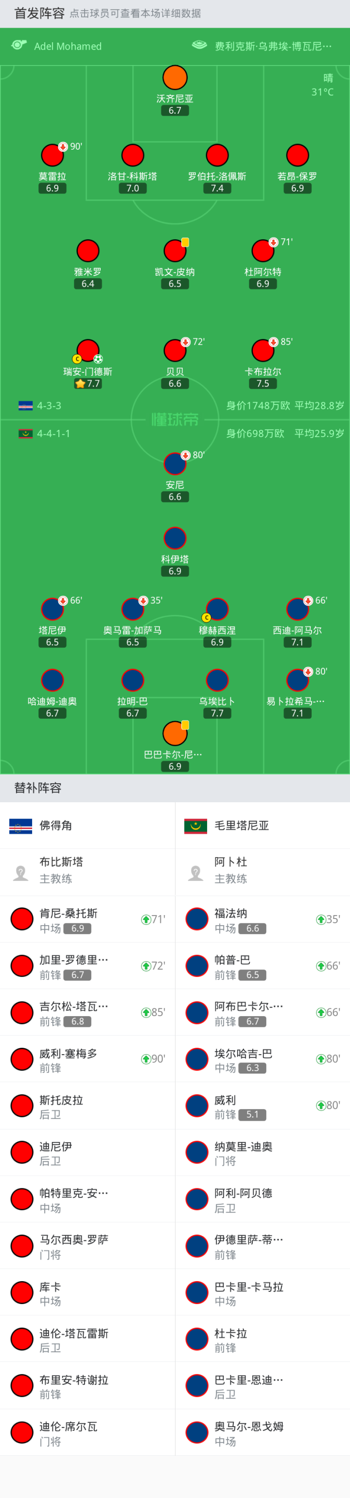 上场替补:80'7-埃尔哈吉-巴, 35'6-福法纳, 66'27-阿布巴卡尔-卡马拉, 66'25-帕普-巴, 80'17-威利