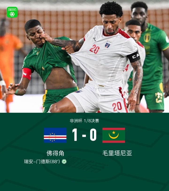 北京时间1月30日非洲杯1/8决赛,佛得角主场对阵毛里塔尼亚。上半场,两队机会不多。下半场最后时刻,毛里塔尼亚球员威利回传失误,门将无奈送点,门德斯主罚命中绝杀对手。全场比赛结束,佛得角1-0击败毛里塔尼亚,晋级非洲杯八强。