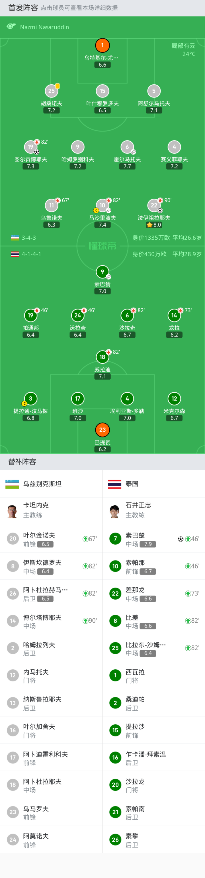 上场替补:82'8-伊斯坎德罗夫, 90'+114-博尔塔博耶夫, 67'20-叶尔金诺夫, 82'26-阿卜杜拉赫马托夫