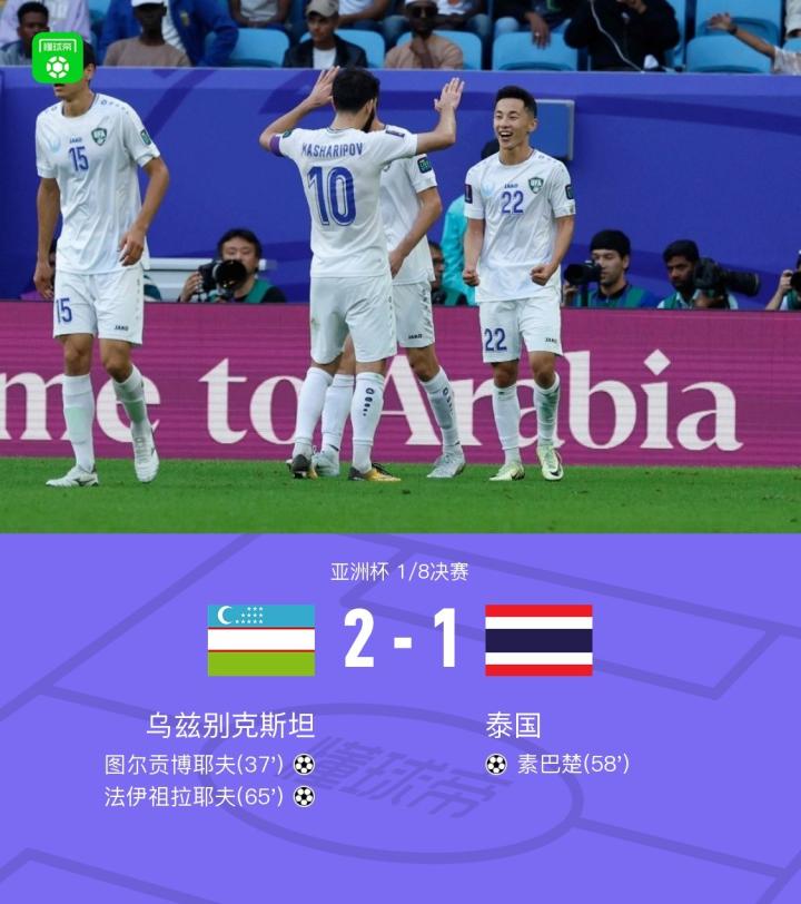 北京时间1月30日19:30,亚洲杯1/8决赛,乌兹别克斯坦与泰国在贾努布球场展开角逐,马来西亚裁判纳萨鲁丁执法本场比赛。上半场,乌鲁诺夫失良机,霍尔马托夫助攻图尔贡博耶夫破门,泰国仅一脚打门。下半场,素巴楚弧线球世界波扳平比分,法伊祖拉耶夫贴地斩制胜。最终,乌兹别克斯坦2-1击败泰国,晋级亚洲杯8强,1/4决赛将战卡塔尔。