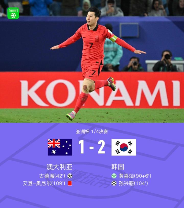 北京时间2月2日亚洲杯1/4决赛,澳大利亚对阵韩国。上半场薛英佑越位在先,黄喜灿进球被吹无效,随后古德温凌空破门帮助澳大利亚取得领先;下半场杜克错失良机,最后阶段孙兴慜造点,黄喜灿点射破门绝平比分,常规时间内双方战成1-1;进入加时赛后孙兴慜任意球直接破门逆转比分,艾登-奥尼尔凶狠铲抢吃到红牌,最终韩国2-1逆转澳大利亚晋级亚洲杯四强。