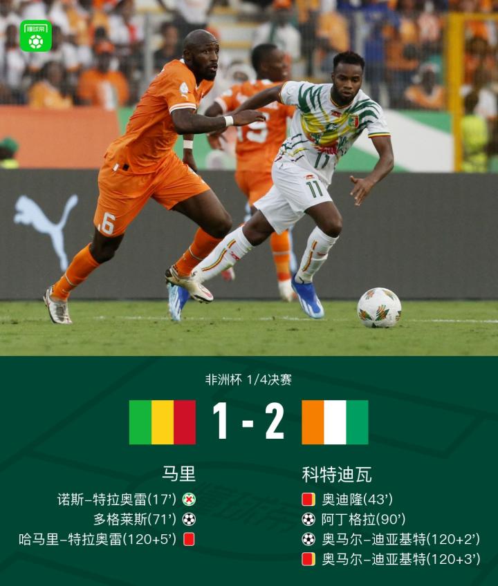北京时间2月4日非洲杯 1/4决赛,马里对阵科特迪瓦。上半场奥迪隆犯规送点,诺斯-特拉奥雷点球被扑出,半场尾声奥迪隆犯规吃到第二张黄牌被罚下。下半场多格莱斯轰出世界波,常规时间最后时刻阿丁格拉门前捅射扳平。加时最后时刻奥马尔-迪亚基特绝杀,随后脱衣庆祝吃到第二张黄牌被罚下,赛后马里球员围攻裁判,哈马里-特拉奥雷被出示直红。最终科特迪瓦历经加时2-1逆转马里晋级4强。