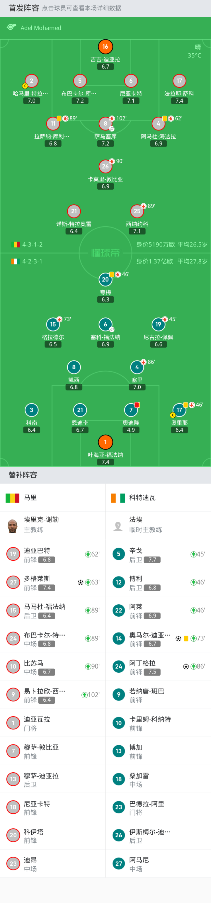 马里首发:2-哈马里-特拉奥雷, 21-诺斯-特拉奥雷, 8-萨马塞库, 11-拉萨纳-库利巴利, 16-吉吉-迪亚拉, 17-法拉耶-萨科, 4-阿马杜-海达拉, 5-布巴卡尔-库亚特, 6-尼亚卡特, 25-西纳约科, 26-卡莫里-敦比亚