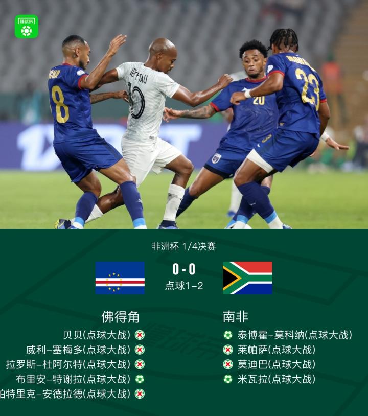 北京时间2月4日非洲杯1/4决赛,佛得角对阵南非。上半场,两队互交白卷。下半场最后时刻,吉尔松射门击中门框弹出,错失绝杀。加时赛,两队依旧毫无建树,最终进入点球大战。点球大战中,南非门将威廉斯发挥神勇四次扑出对方的点球。全场比赛结束,南非通过点球大战2-1击败佛得角杀入四强。