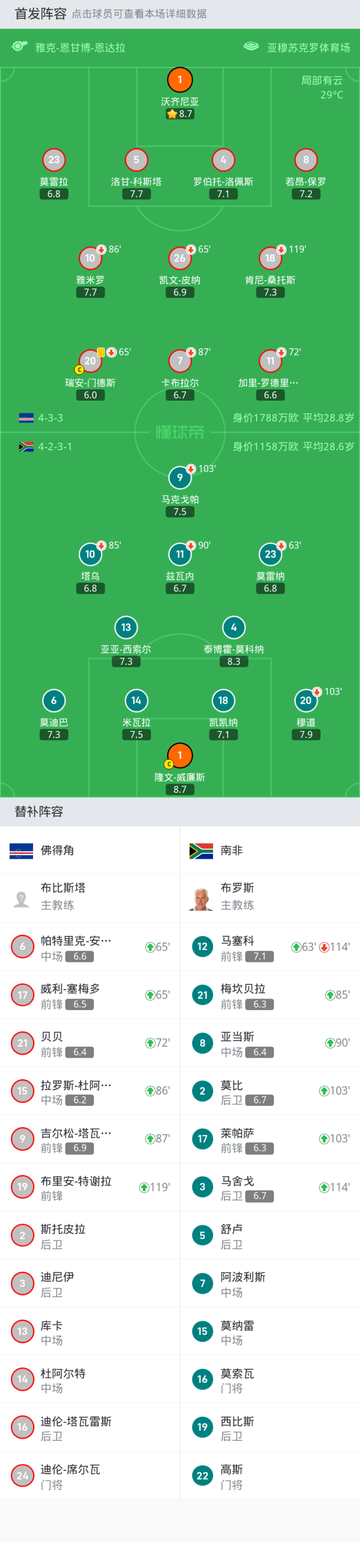 南非首发:1-隆文-威廉斯, 18-凯凯纳, 11-兹瓦内, 23-莫雷纳, 10-塔乌, 14-米瓦拉, 6-莫迪巴, 13-亚亚-西索尔, 4-泰博霍-莫科纳, 20-穆道, 9-马克戈帕