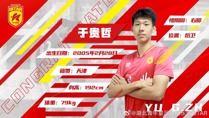 于贵哲,2005年2月出生,天津东丽人,司职中后卫,并多次入选中国足协05年龄段集训营。2022年加盟湖北青年星足球俱乐部一线队,同年作为主力中后卫代表球队征战中乙联赛,两个赛季共计出场26次,首发25次,打入2粒进球。于贵哲身体条件出色,具备后场组织能力,同时是国内极其罕见的左脚中后卫,加盟来通过职业联赛的历练进步迅速,表现愈发稳健。