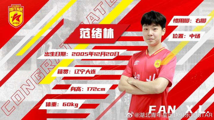 范绪林,2005年12月出生,司职中场,辽宁大连人,2017年进入星辉青训学院,是2005年龄段的中场核心球员。2018-2019年,范绪林率队分别获得全国05年龄段冠军杯赛冠军、青超联赛季军、全国锦标赛亚军及青运会第三名,并多次入选中国足协05年龄段集训营。2021年,范绪林入选中国足协U16耐克训练营。2022年8月,16岁的范绪林入选湖北青年星一线队,2023年中乙联赛首轮,范绪林首发出战,完成职业联赛首秀,整个2023赛季,范绪林共在中乙联赛中出场14次,其中首发12次,场均出战65分钟,打入两粒进球。在职业赛场上范绪林在中场的控球和组织都颇有灵性,让人眼前一亮,同时他还创造了不少远射以及定位球威胁。在去年5月份,范绪林还曾赴西甲和西乙的多支俱乐部试训。