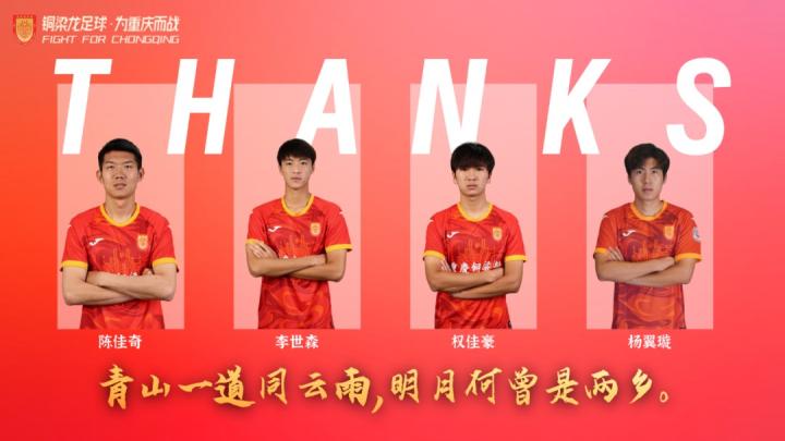 奔向未来,共赴山海。感谢以上四位球员为重庆铜梁龙的拼搏和付出,你们在这片足球热土所留下的种种美好瞬间,会成为大家无比珍贵的记忆,祝诸君前程似锦,遂愿如意,希望明天,我们会以最足球的方式,在热爱的绿茵场,再度热血相会。加油,雄起!