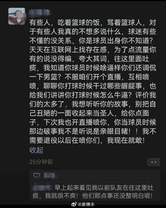 麦穗丰社媒配文道:“网传赵继伟在朋友圈怒喷前队友,莫非跟国青队友郭晓鹏的直播连线有关?”随后还配上了此前郭晓鹏和高尚连线谈中国男篮的视频。