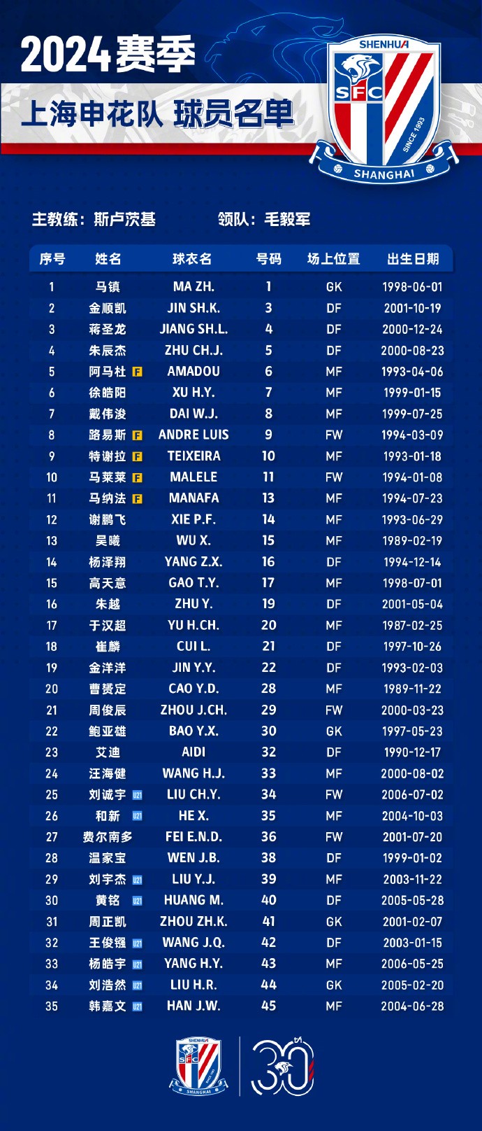 上海申花公布了新赛季35人大名单,5外援在列,谢鹏飞身穿14号、高天意身穿17号球衣。