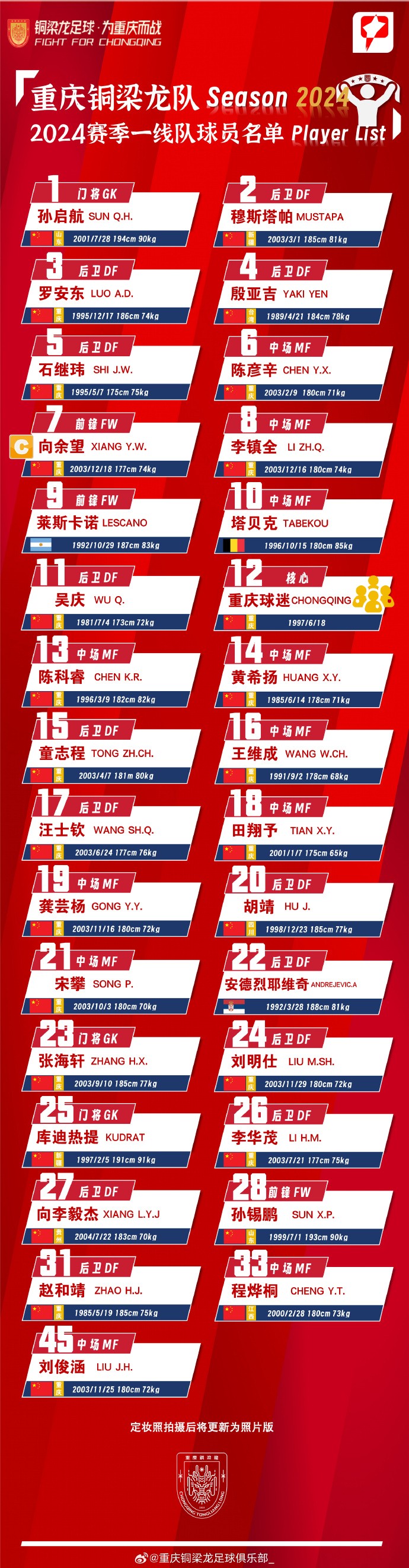 懂球帝首页>动态> 重庆铜梁龙30人名单:向余望队长,塔贝克10号,12号留给球迷