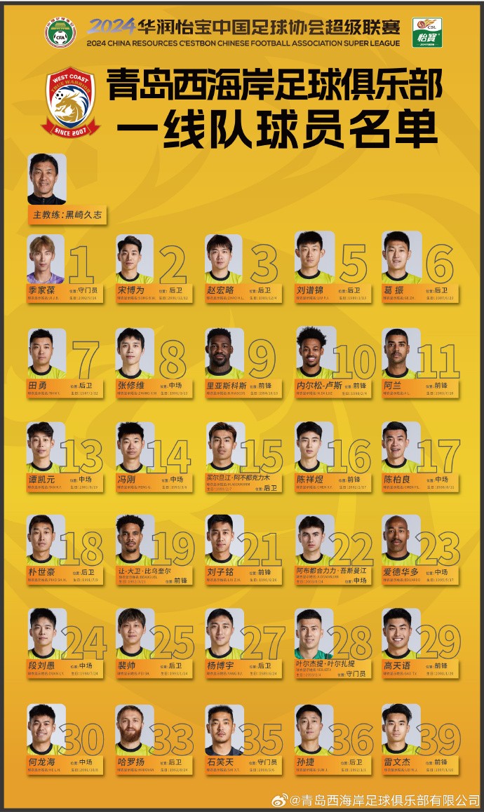 青岛西海岸公布了参加新赛季中超的30人大名单,5名外援领衔,阿兰将身披11号球衣。
