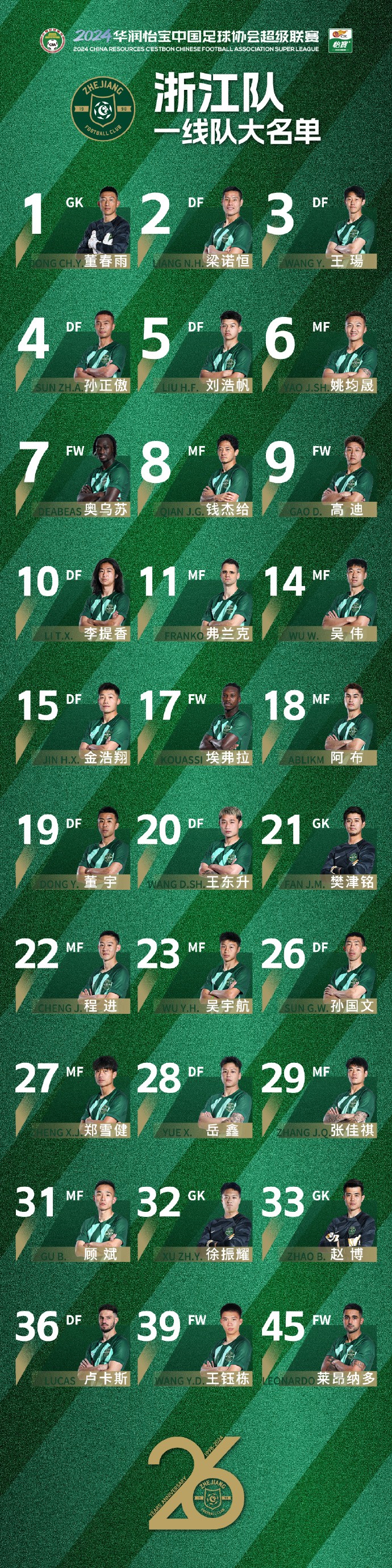 扫描下载懂球帝首页>动态> 浙江队新赛季30人大名单:5外援在列,奥乌苏穿7号
