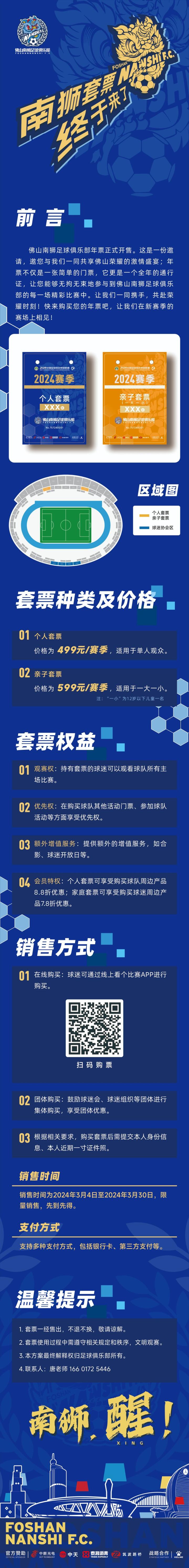 此外,佛山南狮还公布了新赛季票务公告,套票分为两个种类,个人套票499元,亲子套票599元。